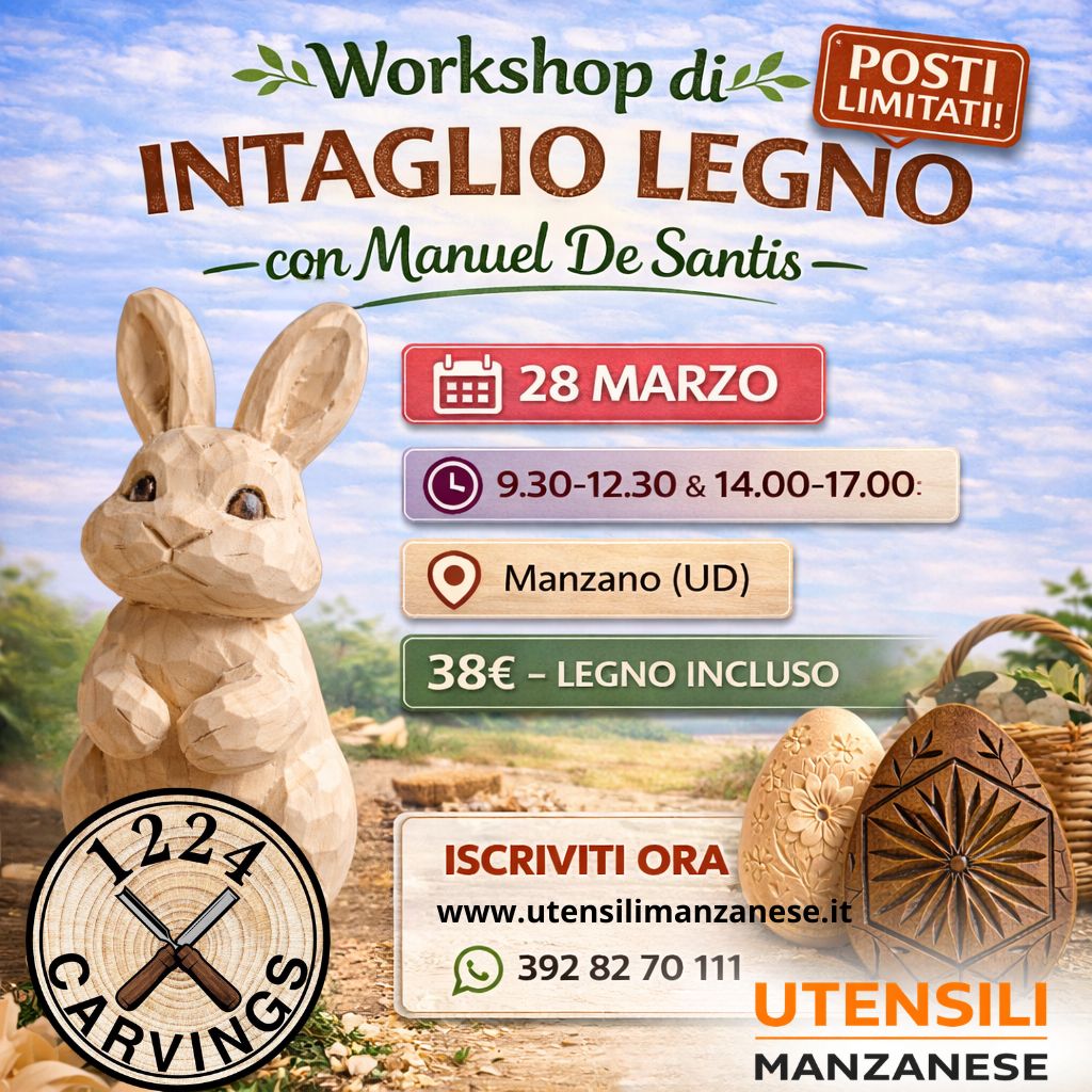 Il workshop si terrà il 28 marzo a Manzano (UD), con orario 9.30–12.30 e 14.00–17.00. Il costo di partecipazione è di 38 euro, legno incluso. I posti sono limitati, quindi è consigliata la prenotazione anticipata.