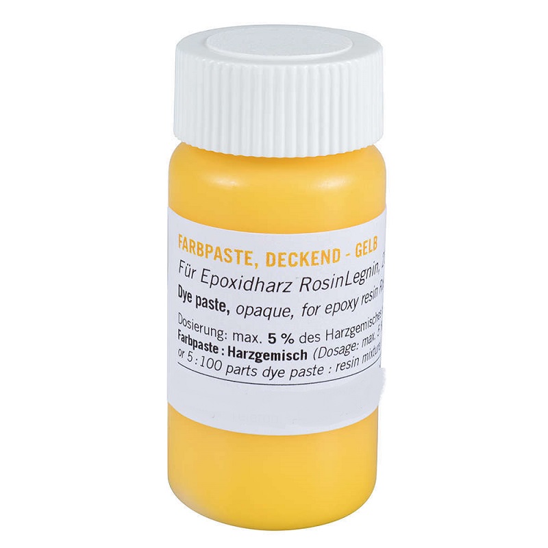 Pasta colorata altamente concentrata e di facile dosaggio, per resina epossidica Rosin Legnin (N° 450400). Quantità max. dosabile in miscela 5 % (max. 5 g per 100 g di miscela resinosa). I colori sono mescolabili a piacere, anche in combinazione con coloranti concentrati trasparenti (N° 450401-450405). Contenuto: 20 m