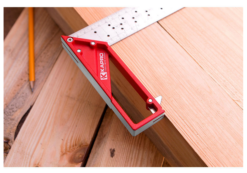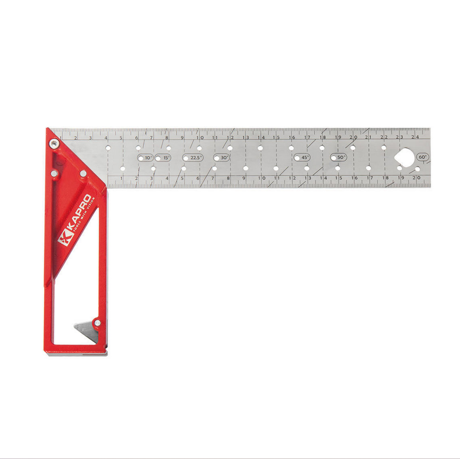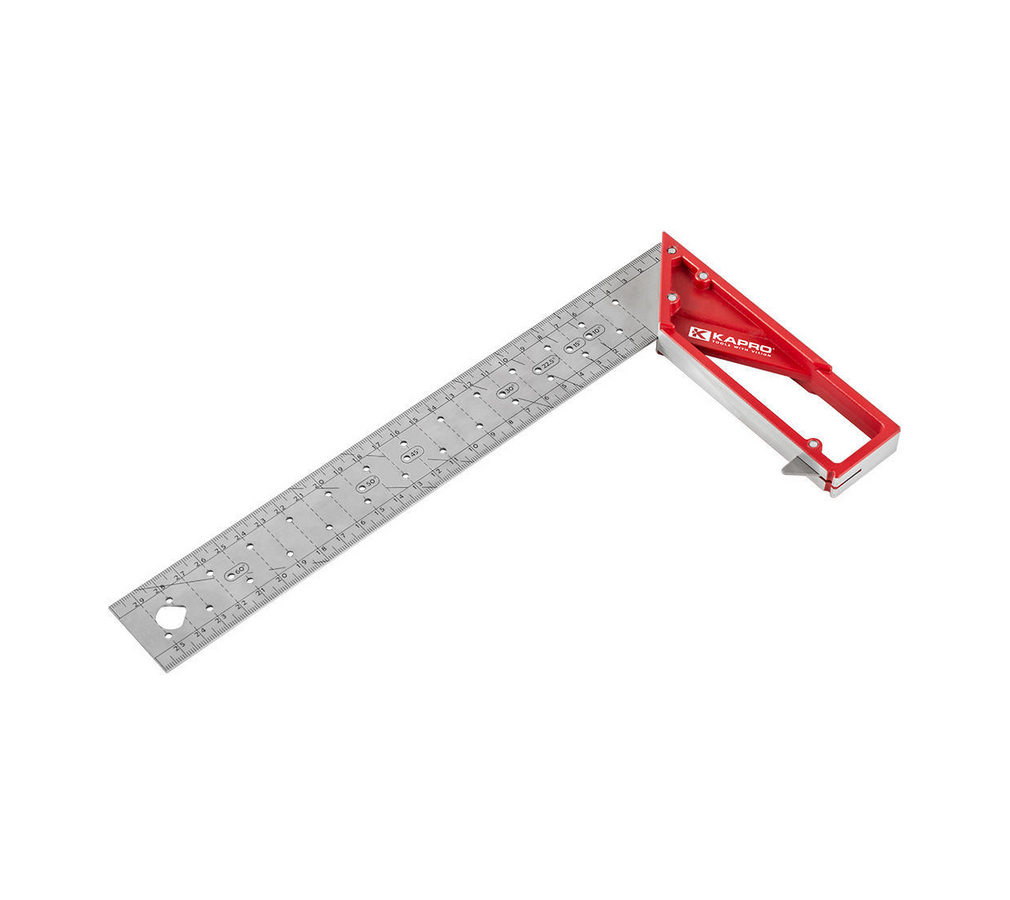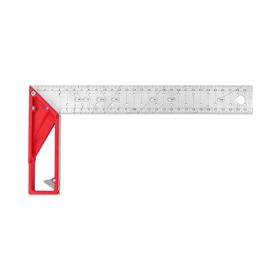 Squadra universale con lama in acciaio inossidabile e scala millimetrica incisa, fori di marcatura per ogni cm e per gli angoli da 10°, 15°, 22,5°, 50° e 60°. Testa in alluminio fuso con squadra integrata da 30° e sistema antiribaltamento svitabile. Precisione di 0,25 mm su 100 mm.