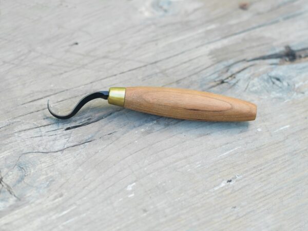 Il coltello a uncino Single Bevel Sloyd è perfetto per formare le cavità di cucchiai e ciotole. La lama profondamente curva a un solo taglio è affilata fino alla punta. Per una maggiore resistenza, il codolo di ogni coltello si estende completamente attraverso il manico in legno di ciliegio splendidamente trattato. Presenta anche una ghiera in ottone per una maggiore stabilità. La lunghezza complessiva di questo coltello è di 20.3CM. con un raggio di 1.3CM.