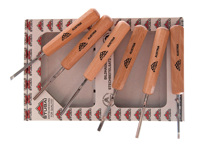 Le lame delle sgorbie STUBAI sono prodotte con uno speciale acciaio al cromo-vanadio sottoposto ad un moderno trattamento di tempra per ottenere una durezza di 58-60 HRC (Hardness Rockwell Cone) garanzia di una lunga durata di taglio.
