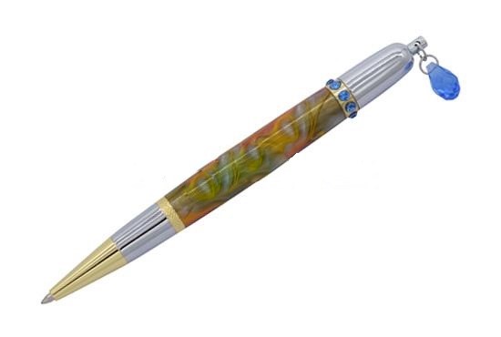 Kit penna decorato con piccoli cristalli sul corpo e un ciondolo (a goccia) in resina azzurra sul terminale.