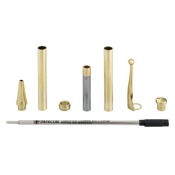 Kit di montaggio di alta qualità per penne a sfera in ottone con clip infrangibile. Disponibile nella versione cromata o placcata oro 24 carati. Ricambio con sfera in carburo di tungsteno, inchiostro a base oleosa. Per diametro di foro 7 mm.