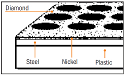 Una base di acciaio perforato viene incastrata all’interno di una base in plastica utilizzando una forte pressione. L’acciaio viene poi ricoperto con diamante naturale incastrato in una placca di nickel. La copertura di diamante assicura un’affilatura veloce mentre la dentellatura di plastica trattiene l’acqua che funge da lubrificante e disperde la polvere che i diamanti rimuovono durante il processo di affilatura.