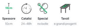 EPOXYTABLE 10 è specificamente sviluppata per colate in grandi spessori e non è compatibile con applicazioni che richiedono coloranti acrilici o liquidi. Assicurati di seguire le istruzioni per garantire risultati ottimali.