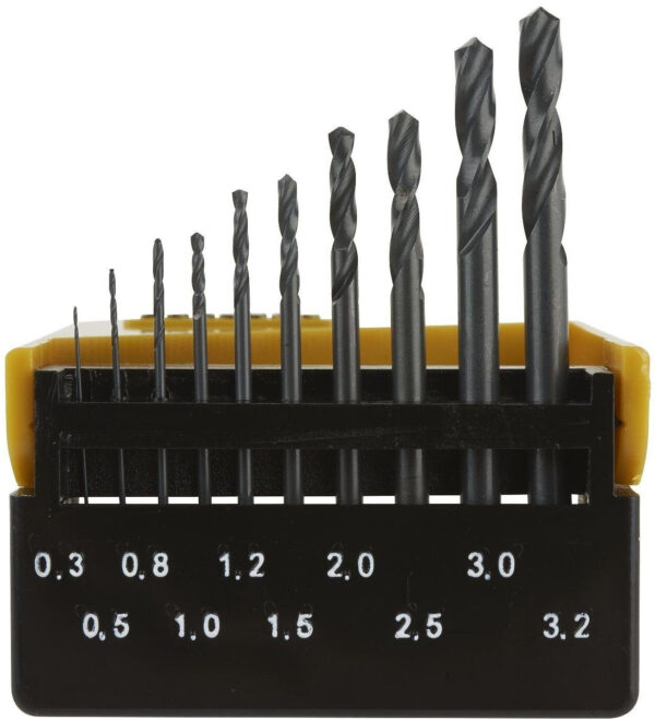 Punte elicoidali HSS in cassetta 10 pezzi. Simile alla norma DIN 338. Ø 0,3 – 0,5 – 0,8 – 1 – 1,2 – 1,5 – 2 – 2,5 – 3 – 3,2. Per forare metalli non ferrosi, acciaio e inox.