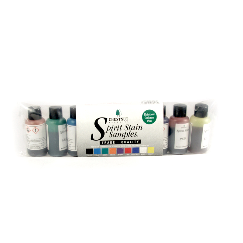 Confezione prova di tutti i colori Chestnut Spirit Stain colori “arcobaleno”. Può essere usato puro o miscelato per cercare nuove tinte. Si possono anche usare per tingere facilmente il turapori alla cellulosa o la vernice melaminica Chestnut. Le bottigliette sono da 25 ml. per un totale di nove colori nero, blu, verde, arancione, viola, rosso, Blu reale, giallo e bianco.
