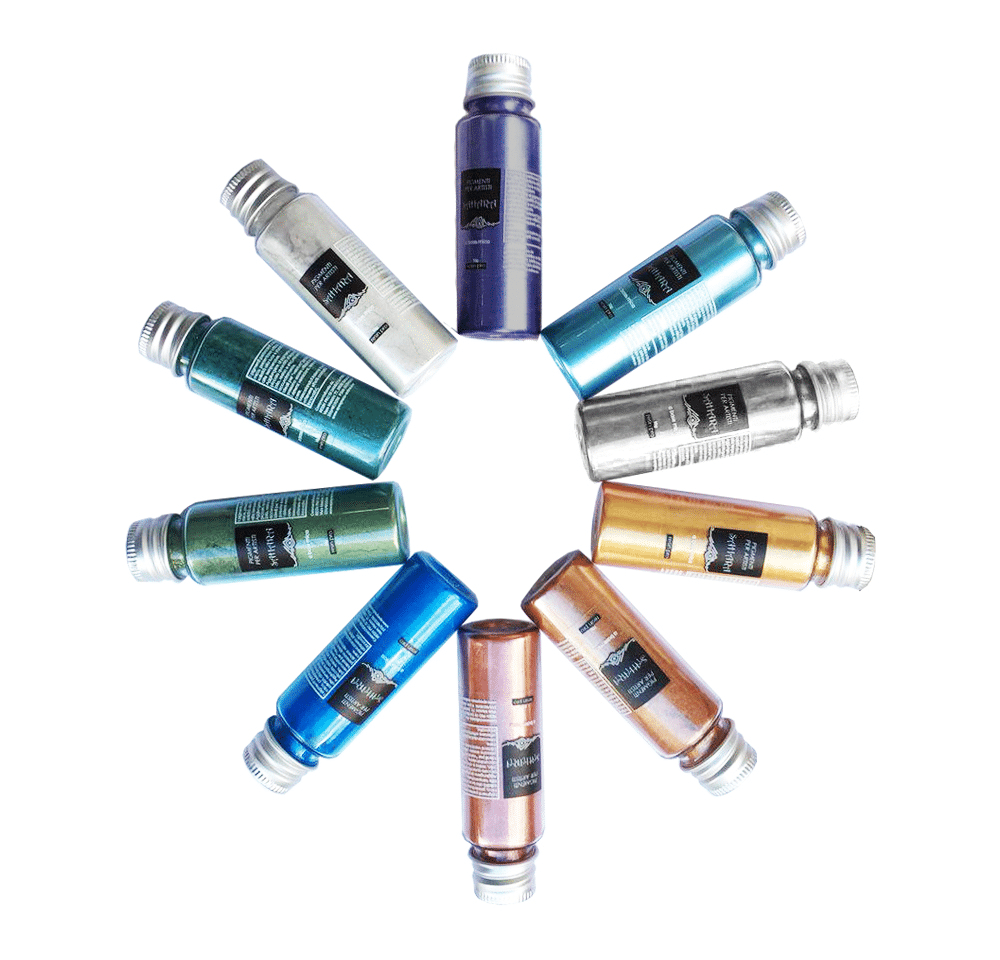 Lucidissimi pigmenti metallici compatibili con resine epossidiche, poliuretaniche, acrilici, vernici e qualsiasi altro materiale artistico. Ideale per creare tavoli in resina, creazioni fai da te, mobili artigianali.